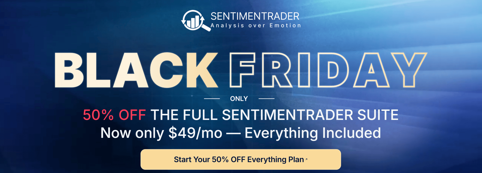 The Black Friday Sale is now Live – Get 50% off on the Full SentimenTrader Suite and unlock all research and tools in the Everything Package, at just $49/mo.