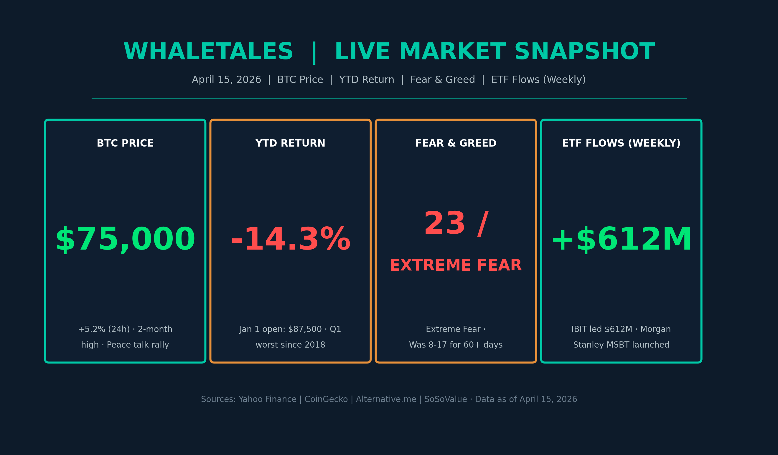 WhaleTales is published every Wednesday. Subscribe at whaletales.io · All data sourced from Bloomberg, CoinDesk, SoSoValue, SEC filings, CoinGlass, Alternative.me, and public blockchain data as of April 15, 2026. This newsletter is for informational purposes only and does not constitute financial advice.