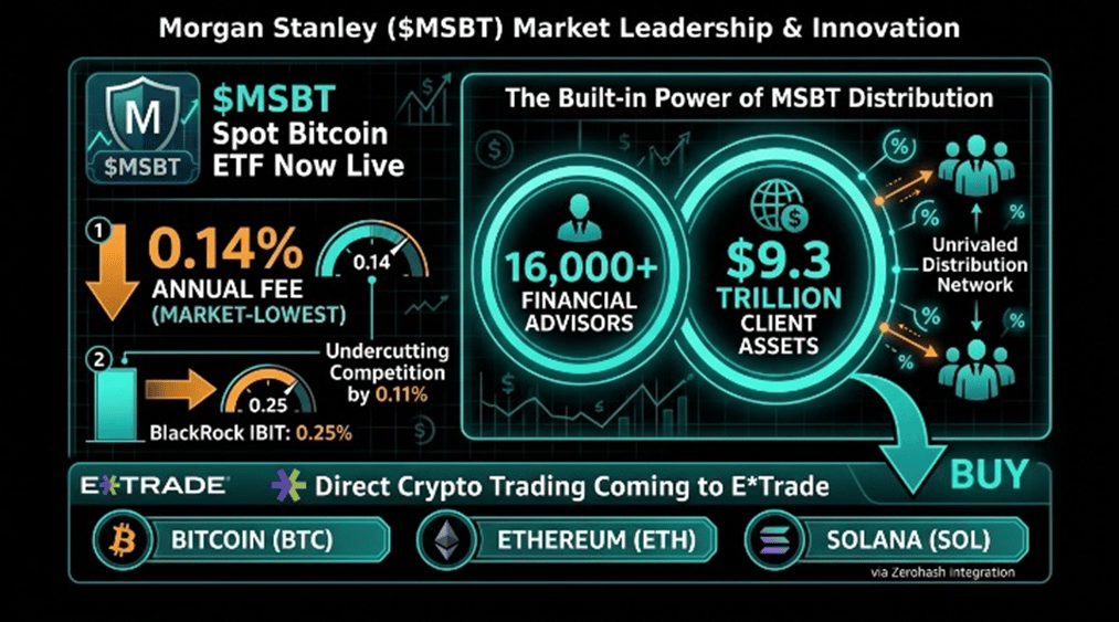 Morgan Stanley's spot Bitcoin ETF ($MSBT) began trading on NYSE Arca at 0.14% annual fee, the lowest in the market, undercutting BlackRock's IBIT at 0.25%. With 16,000 financial advisors and $9.3 trillion in client assets, MSBT has a built-in distribution network no other Bitcoin ETF can match. The bank is also preparing direct crypto trading on E*Trade via Zerohash for Bitcoin, Ethereum, and Solana.