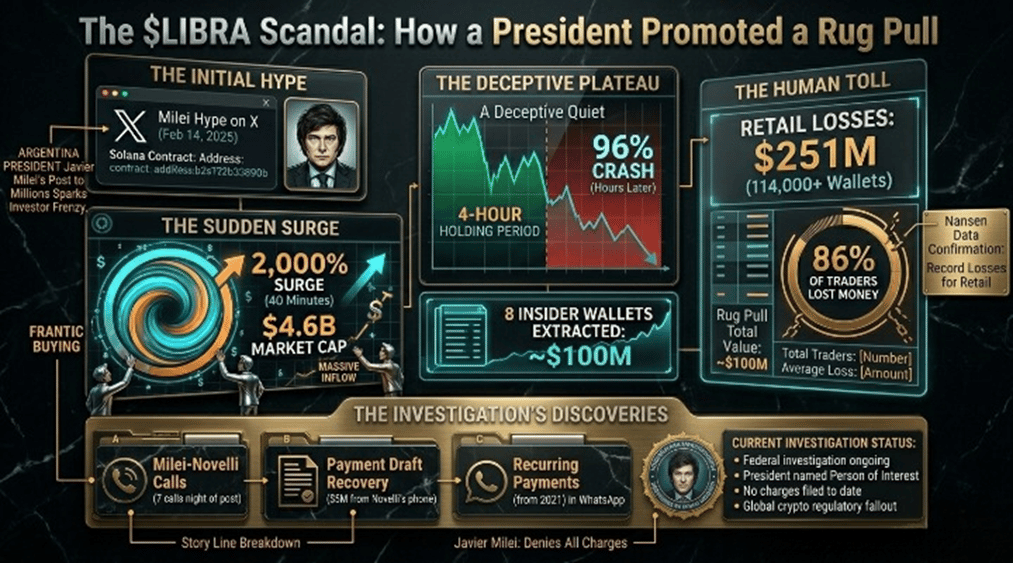 On Valentine's Day 2025, Argentine President Javier Milei posted the Solana contract address for a token called $LIBRA to his millions of followers on X. Within 40 minutes, the token surged over 2,000%, hitting a $4.6 billion market cap. Hours later, it crashed 96%. Eight insider wallets linked to the project extracted between $99 million and $107 million. Over 114,000 retail wallets recorded losses totalling $251 million, with 86% of all traders losing money, according to Nansen data.