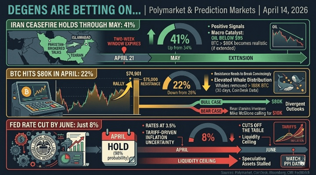 The Iran ceasefire is the biggest variable. The two-week window expires around April 21. If talks produce an extension, BTC challenges $80K. If they collapse, oil spikes and fear returns. BlackRock reports Q1 earnings on April 14, and IBIT flow data will set the tone.