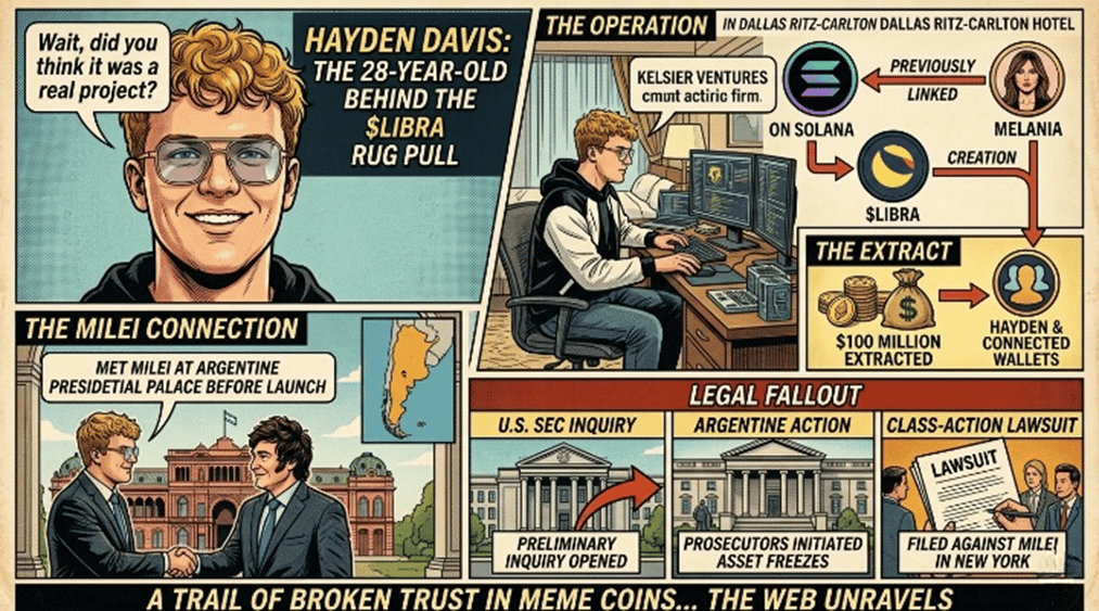 Behind $LIBRA is Hayden Mark Davis, a 28-year-old American crypto marketer whose firm, Kelsier Ventures, created the token on Solana. Davis met Milei at the Argentine presidential palace before the launch and was at a Dallas Ritz-Carlton hotel coordinating the operation on launch night while Novelli made the calls. Davis and connected wallets extracted roughly $100 million. He was also linked to the MELANIA meme coin. The U.S. SEC has opened a preliminary inquiry, Argentine prosecutors have initiated asset freezes, and a class-action lawsuit has been filed against Milei in New York.