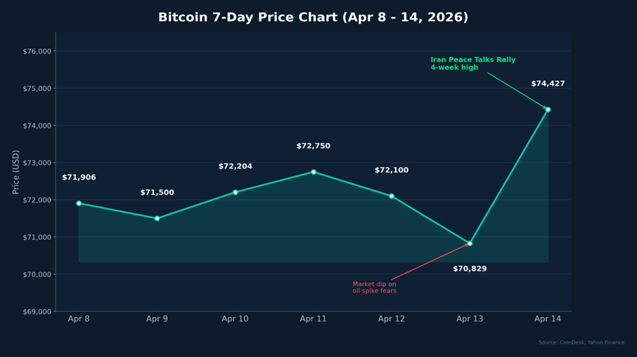 1. Bitcoin Hits 4-Week High at $74,901 on Iran Peace Talks