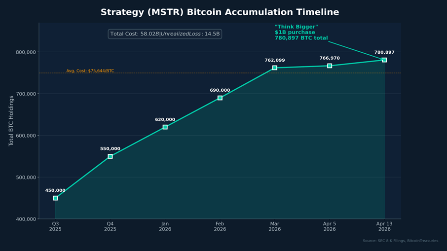 Michael Saylor posted his signature acquisition tracker on Sunday with two words: "Think Bigger." Strategy confirmed via SEC 8-K on April 6 that it bought 4,871 BTC for $329.9 million (average $67,718) between April 1-5, bringing confirmed holdings to 766,970 BTC. Reports from April 13 indicate an additional purchase of roughly 13,927 BTC for $1 billion, bringing total holdings to approximately 780,897 BTC.