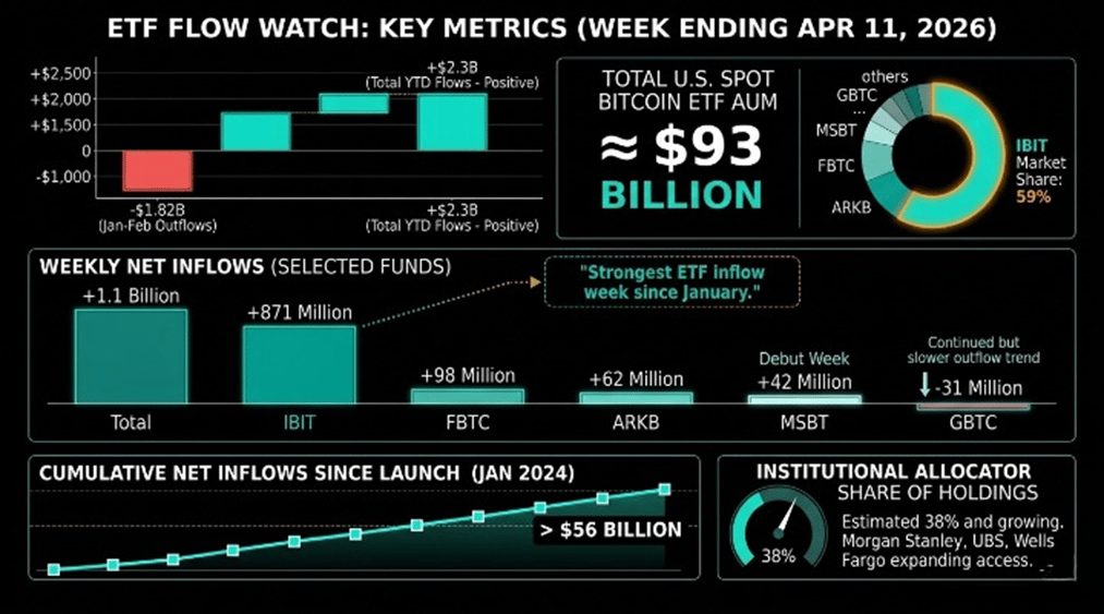 The week ending April 11 delivered the strongest ETF inflow week since January. U.S. spot Bitcoin ETFs absorbed $1.1 billion in net capital, led by BlackRock's IBIT at $871 million. Fidelity's FBTC added $98 million, Ark/21Shares pulled in $62 million, and Morgan Stanley's newly launched $MSBT attracted $42 million in its debut week. Grayscale's $GBTC was the lone notable outflow at $31 million.
