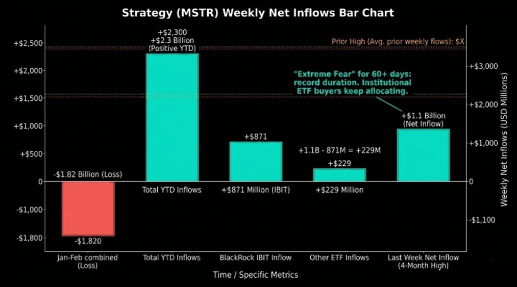 Crypto ETFs pulled in $1.1 billion in net inflows last week, the strongest weekly demand since January. Year-to-date flows have turned positive at $2.3 billion after January-February bled $1.82 billion combined. BlackRock's IBIT led with $871 million. The Fear and Greed Index has sat in Extreme Fear for 60+ consecutive days (a record), yet institutional ETF buyers keep allocating. Full breakdown below in ETF Flow Watch.
