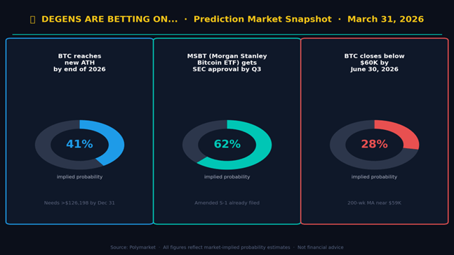 Morgan Stanley MSBT fee disclosed: Morgan Stanley priced its planned spot Bitcoin ETF (MSBT) at a 0.14% management fee, the lowest among all rival Bitcoin ETF products if approved. SEC review continues; analysts maintain approximately 62% implied probability of Q3 approval on Polymarket.