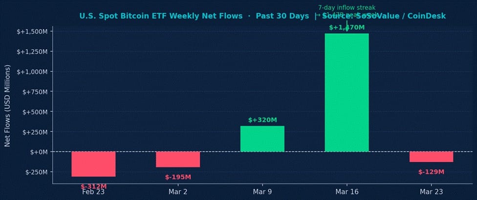 U.S. spot Bitcoin ETFs recorded their strongest weekly run of 2026 in the week ending March 16, with an estimated $1.47 billion in cumulative net inflows, a seven-day streak that represented the first sustained positive ETF flow month since October 2025. The momentum stalled sharply after the March 18 FOMC meeting, with outflows resuming as the hawkish inflation outlook rattled risk assets. Net flows for March stand at an estimated $890 million, still tracking positive on the month.