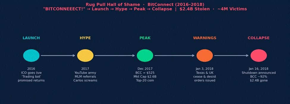 BitConnect Rug Pull Timeline · 2016–2018 · Launch→ Hype → Peak → Collapse · $2.4B Stolen from 4M Victims
