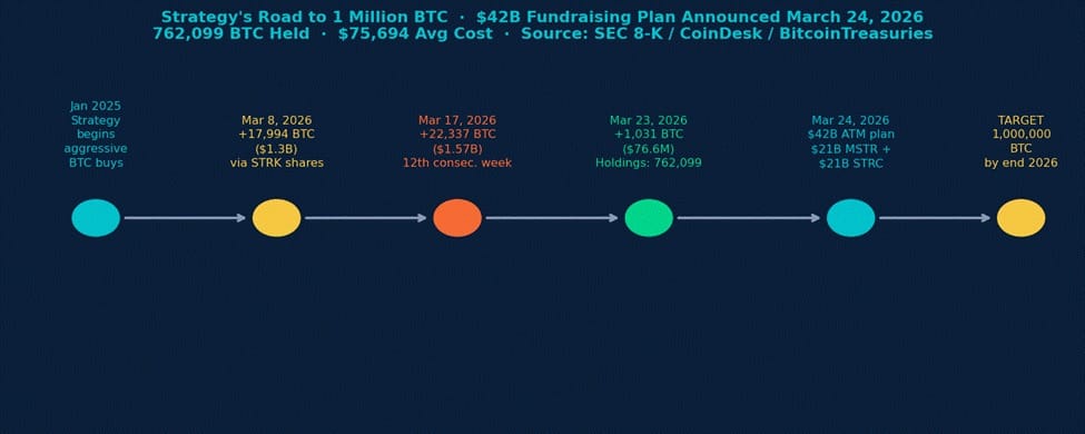 Strategy's Road to 1 Million BTC · $42B Fundraising Plan Announced March 24, 2026 · Source: SEC 8-K / CoinDesk