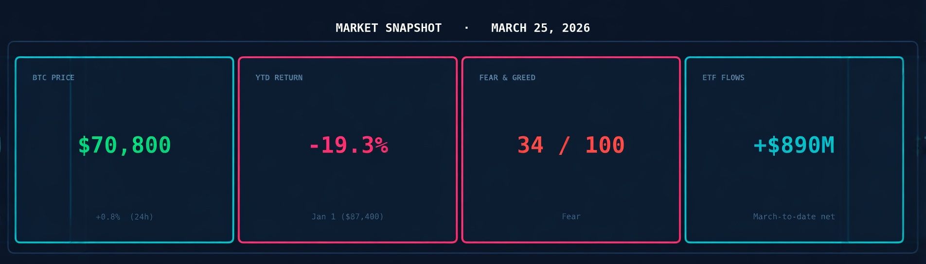 Market Snapshot · BTC $70,800 · YTD -19.3% · Fear & Greed 34 (Extreme Fear) · March ETF Flows +$890M net