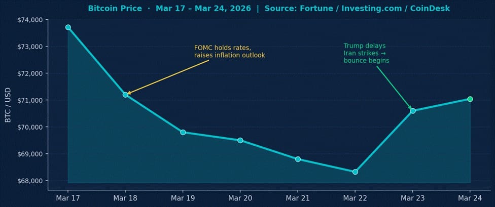 Bitcoin opened the week at around $73,717 on March 17, then got body-slammed twice in quick succession. First blow: the Federal Reserve held rates at 3.5%–3.75% on March 18 but raised its 2026 inflation forecast to 2.7% (both headline and core PCE), hawkish enough to trigger a broad risk-off selloff, with Brent crude already running hot at $107 per barrel due to the Iran war. BTC dipped toward $69,800 on the FOMC day.