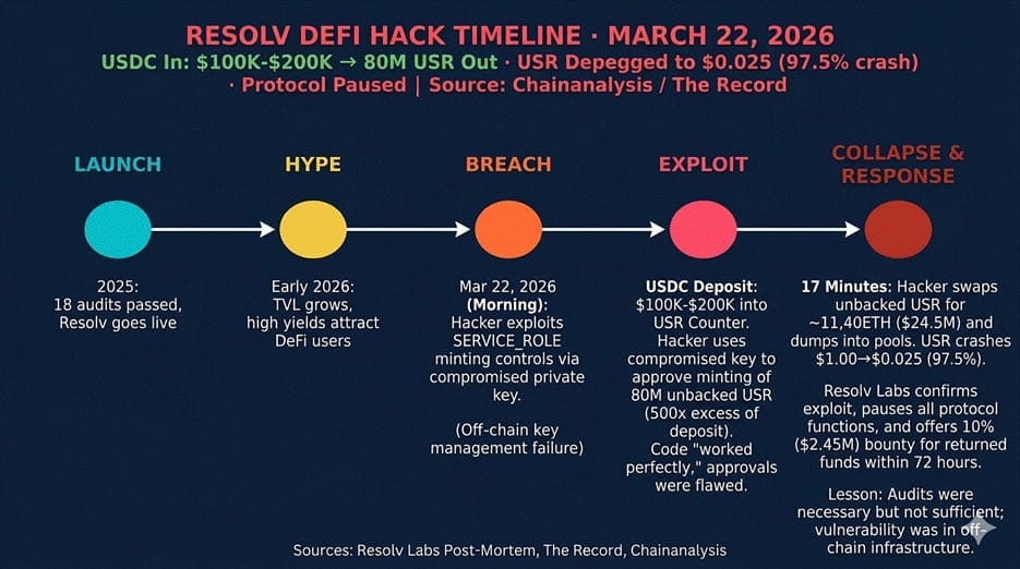 Resolv DeFi Exploit Timeline · March 22, 2026 · Source: Chainalysis/CoinDesk/The Block
