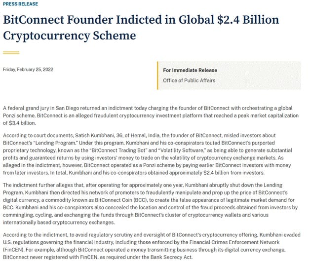 What happened after: BitConnect's Indian founder, Satish Kumbhani, was indicted by the U.S. DOJ in 2022 on fraud and money laundering charges carrying up to 70 years in prison. He remains a fugitive. U.S. promoter Glenn Arcaro pleaded guilty in 2021 and was ordered to pay $17 million in restitution. Carlos Matos has reinvented himself as a motivational speaker. The internet is forever.